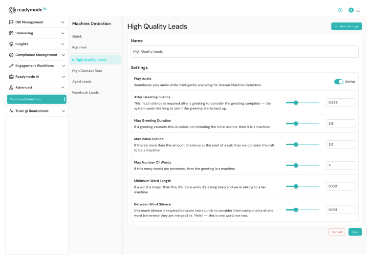 Readymode iQ approaches Answering Machine Detection as part of that complete system. The platform combines adjustable AMD with caller ID reputation monitoring, intelligent number selection, remediation support, voicemail automation, and structured call cadences.